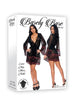 This sexy see-through black mesh robe with lace brocade detail fastens at the waist with a satin tie you can cinch up tight or let fall to show off what’s underneath. Full length sleeves widen at the wrist for a stylish maximalist appeal while the hem panel reaches mid-thigh, grazing the leg with a scalloped edge. A plunging neckline features simply finished edges that complete the sophisticated look.