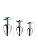 Train that booty with 3 beautiful metal plugs adorned with sparkling emerald gems! Bend over and surprise your partner with a peek of green between your cheeks. Three different plug sizes allow you to take anal play at your own pace, or choose based on what you are in the mood for! Pop in each sleek plug to appreciate the comfortable weight inside your body, thanks to the nickel-free aluminum alloy material. Great for temperature play, you can warm or cool them in water before insertion. The glimmering jewel at the base will draw your partner in to give you more anal attention and pleasure. Use with any lubricant of your choosing and clean after use with mild soap or toy cleaner.
