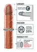The Perfect 2" Extension is a customizable extension that can be easily trimmed at the base for a perfect fit. It's super-stretchy to accommodate most sizes and snug enough to help you last longer. Your partner will enjoy deeper penetration with the 2" extension at the tip, while the ultra-lifelike shaft makes you 33% thicker all around. The soft Fanta Flesh material feels just like a second skin, giving you the length, girth, and confidence you need to satisfy your lover.