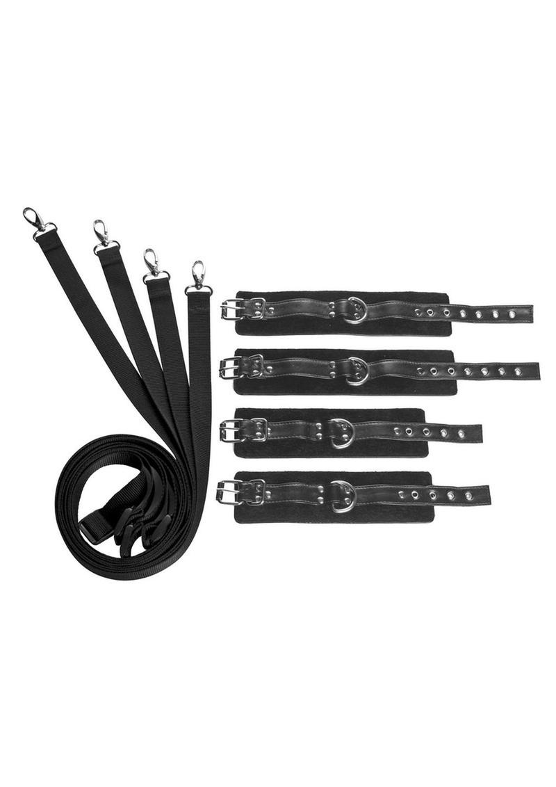 Allow yourself the freedom of giving up control with this eight piece bondage set from Frisky. Imagine yourself doted upon and teased. Lying there in sublime ecstasy, anticipating every move and waiting for the next direction. This beginners bondage set is as comfortable as it is seductive. Made of faux fur details and the softest leather, these cuffs will keep you pleasurably subdued for hours! The adjustable straps and buckles ensure a comfortable experience for the wearer. Each cuff has a solid D-ring and attached easily to the straps with a claw closure. The buckles fasten securely using the grommeted faux leather strap. Use your imagination, this bedroom restraint kit is travel friendly!