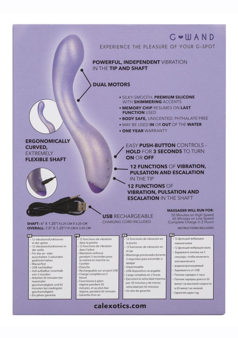 The gorgeous G-Love G-Wand is a powerful curved massager with vibrating shaft and intense vibrating tip. Love yourself just right with the flexible G shaft, 12 functions of shaft vibrations, and 12 independent functions of tip vibrations. The powerful tip and sensually curved shaft are perfect for teasing internal and external sweet spots. For an ultra smooth surface and flexible body, the curved stimulator and massager are covered in a shimmering Silicone
