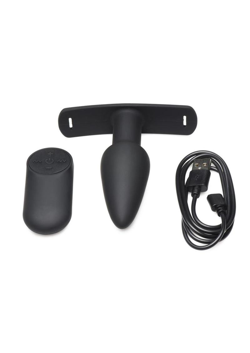 Train your booty to hold a plug in place with the assistance of this harness! The plush, premium silicone plug is perfect for beginners who want to explore long, anal sessions and some light bondage. With a slim, tapered tip the plug can glide in with a little water-based lube easily. The base widens out and then decreases size for the small neck that keeps the plug from going in too far. The thin base makes wearing it between your cheeks comfortable for hours at a time. Use the nylon harness to hold the plug in place while you go about your daily activities and tasks. As a bonus, you can also explore pleasure for longer durations, as well! Use the battery operated remote control to turn on the vibrator and enjoy 4 speeds and 7 patterns of buzzing vibration in your derriere! The harness is fully adjustable; simply use the plastic buckles to tighten or loosen per your own comfort. Recharge the vibrating plug using the USB cable provided. Replace remote control battery as needed. After use, wash the plug with warm water and mild soap, then rinse and spray with a toy cleaner before wiping dry and storing in a cool, dark place separate from other silicone toys. To clean the harness, soak in a solution of warm water and mild soap before rinsing and letting air-dry.