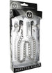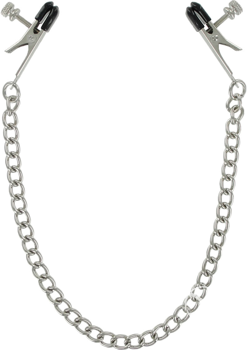Attached to a single chain, once these bullnose style clamps are affixed to the nipples of your plaything, you can control just how much pleasure or pain they deserve. Simply adjust the level of intensity by turning the screw located near the tip of the clamp. Tips are coated in vinyl for added comfort and safety.