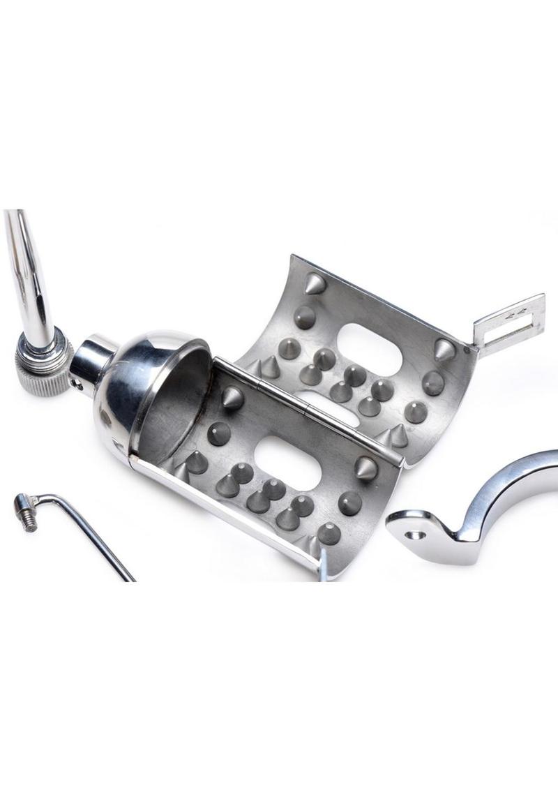 This maniacal chastity cage is built for the extreme! Lined with delicious spikes to bite on your dick while you are stretched from the pee-through sound. Squeeze your balls between the small space created from the included ball ring, and lock all three parts together with the included lock and keys and hand them off to your dom for complete submissions.