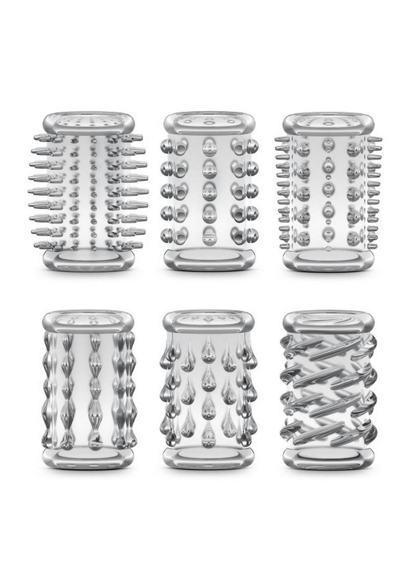 Enjoy this sexual pleasure kit for women, men and couples. Use with your partner or use it solo. It's a simple way to add a new level of pleasure and sensation to your penis, favorite dildo or vibrator. Just slide the sleeve over your shaft. Stack them for even more pleasure. Use more or all of them, mix and match and stack them to create a unique erotic experience every time. Easy to use, and stays in place. Measures 2" Length x 1.4" Width. Comfortably stretches up to 3" Wide. Maximum stretch to 5" Width. Lab tested body safe. Silicone, water based, hybrid lube compatible. 6 piece kit.