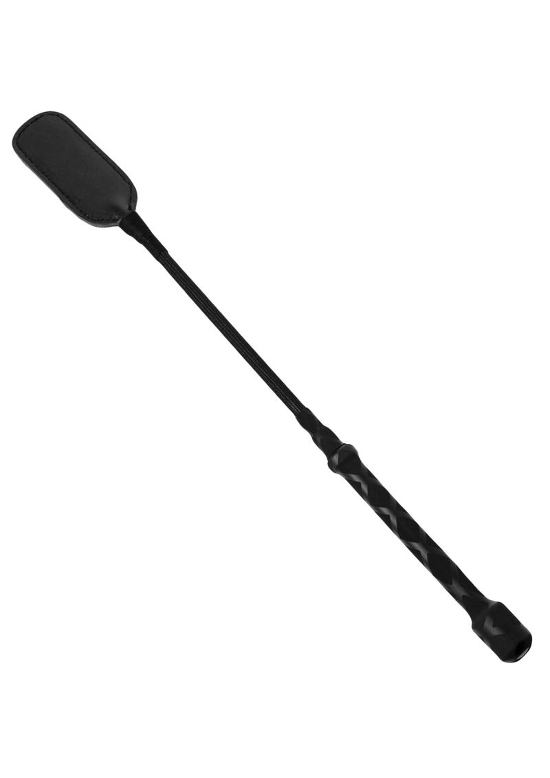 A good crop is an indispensable Dom staple. The classic design of this short riding crop is accented with attractive detailing on the rubber handle. Crisscrossed with elegant corset-style bands, the black contrast stripes enhance the visual appeal as well as your grip. The springy shaft is made of durable plastic covered with woven fabric. The genuine leather tip is a rounded paddle shape, bound in place with black thread.